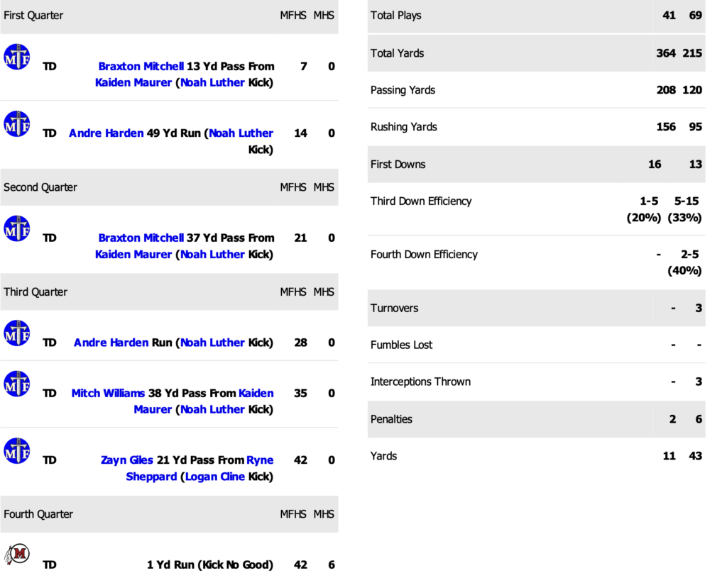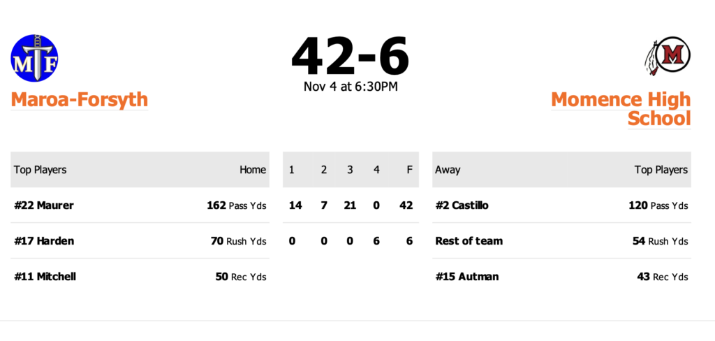 Maroa-Forsyth put the running clock on Momence to win 42-6 in Round Two of the 2A playoffs on Saturday, led by Kaiden Maurer’s three passing touchdowns, two of them to Braxton Mitchell while Andre Harden scored twice on the ground. Bloomington Central Catholic will travel to Maroa-Forsyth for a 2 pm kickoff in the quarterfinals on Saturday.