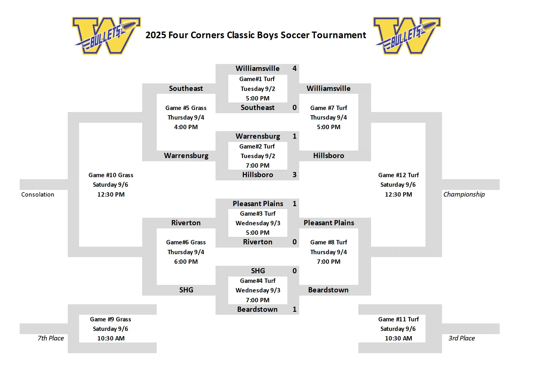 Pleasant Plains’ Nathan Frey scored with 12 minutes remaining in the game to lead the Cardinals to a 1-0 win over Riverton at the Four Corners Tournament in Williamsville. The Cardinals advance to a semifinal matchup against Beardstown on Thursday while Riverton will take on SHG on Thursday. Updated bracket can be found below.