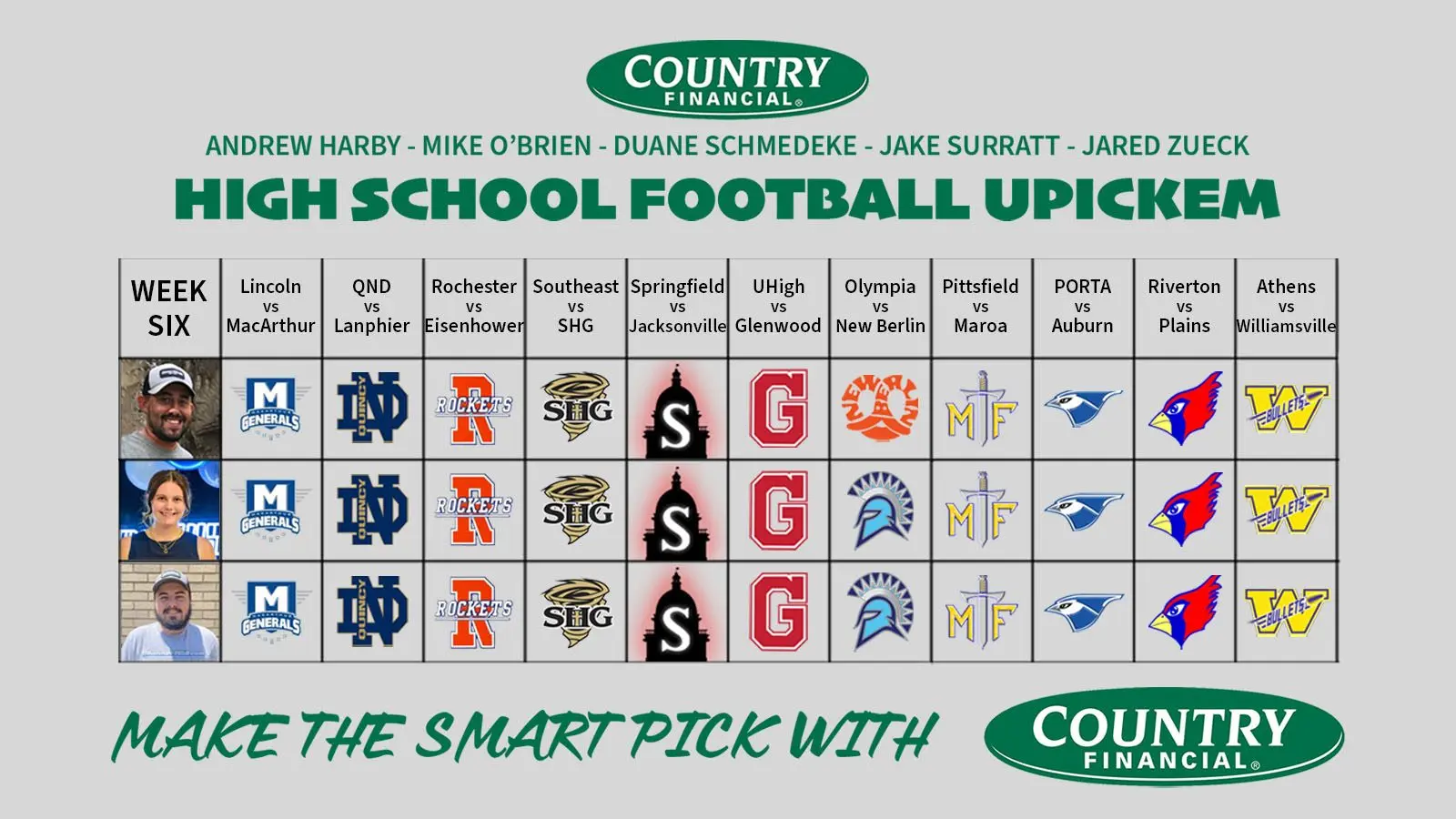 Another week of high school football is here as we are now in week six! DP, Leanna and Michael talk about the CS8 and Sangamo games on the COUNTRY Financial High School Football UPickEm Podcast!