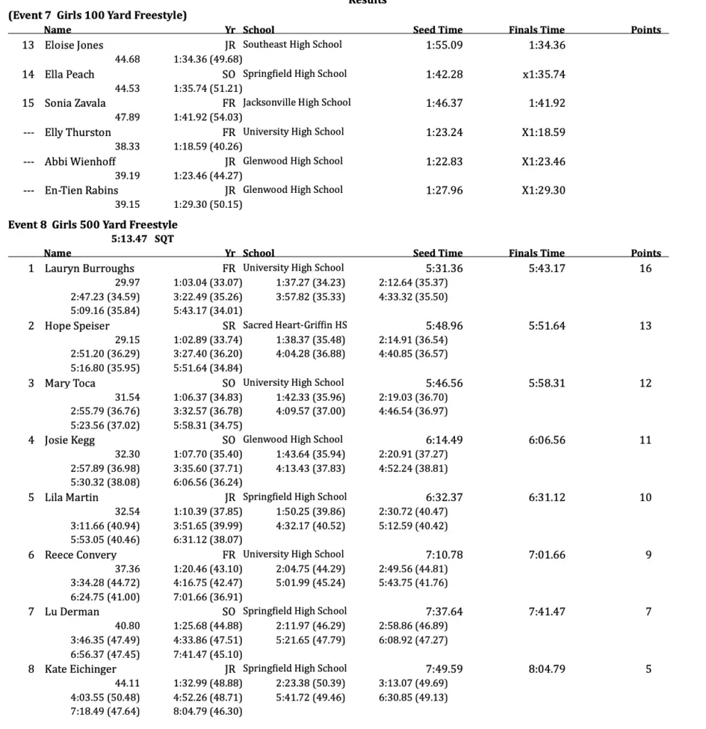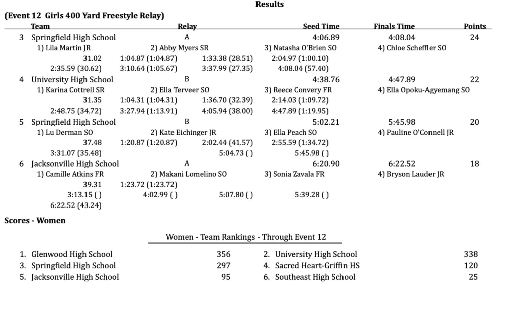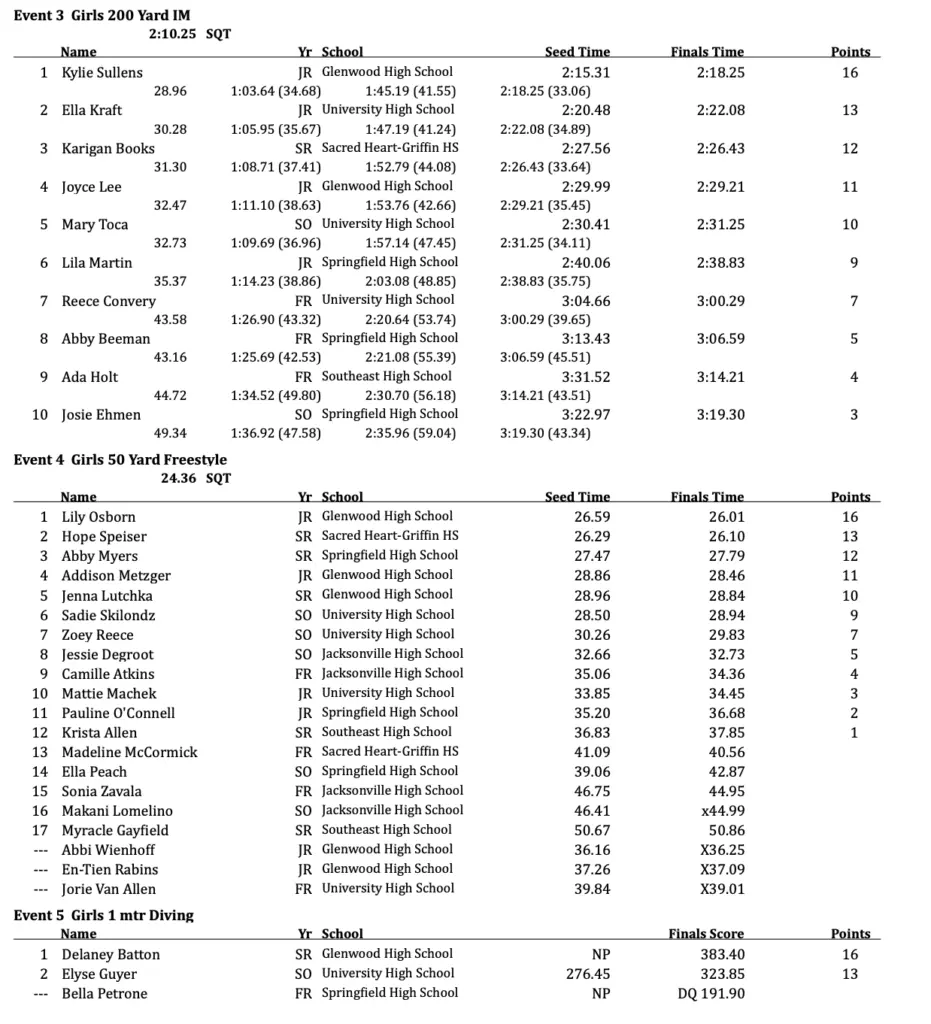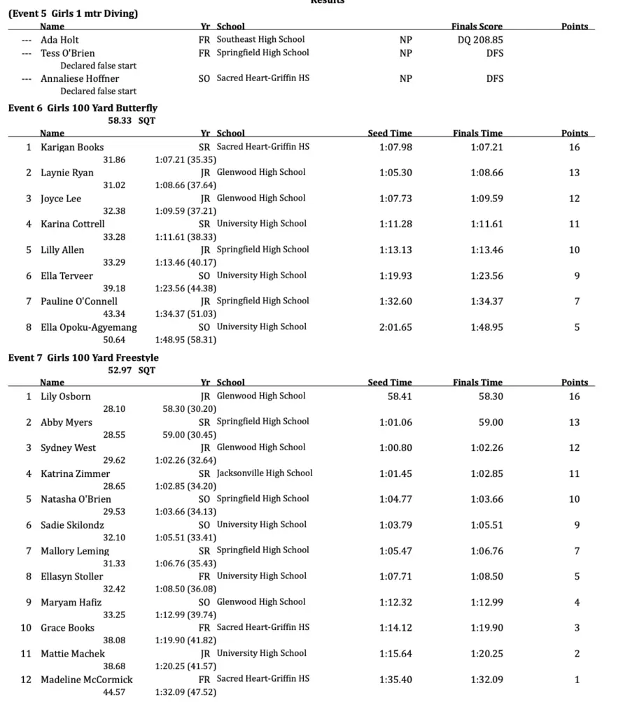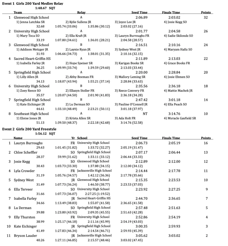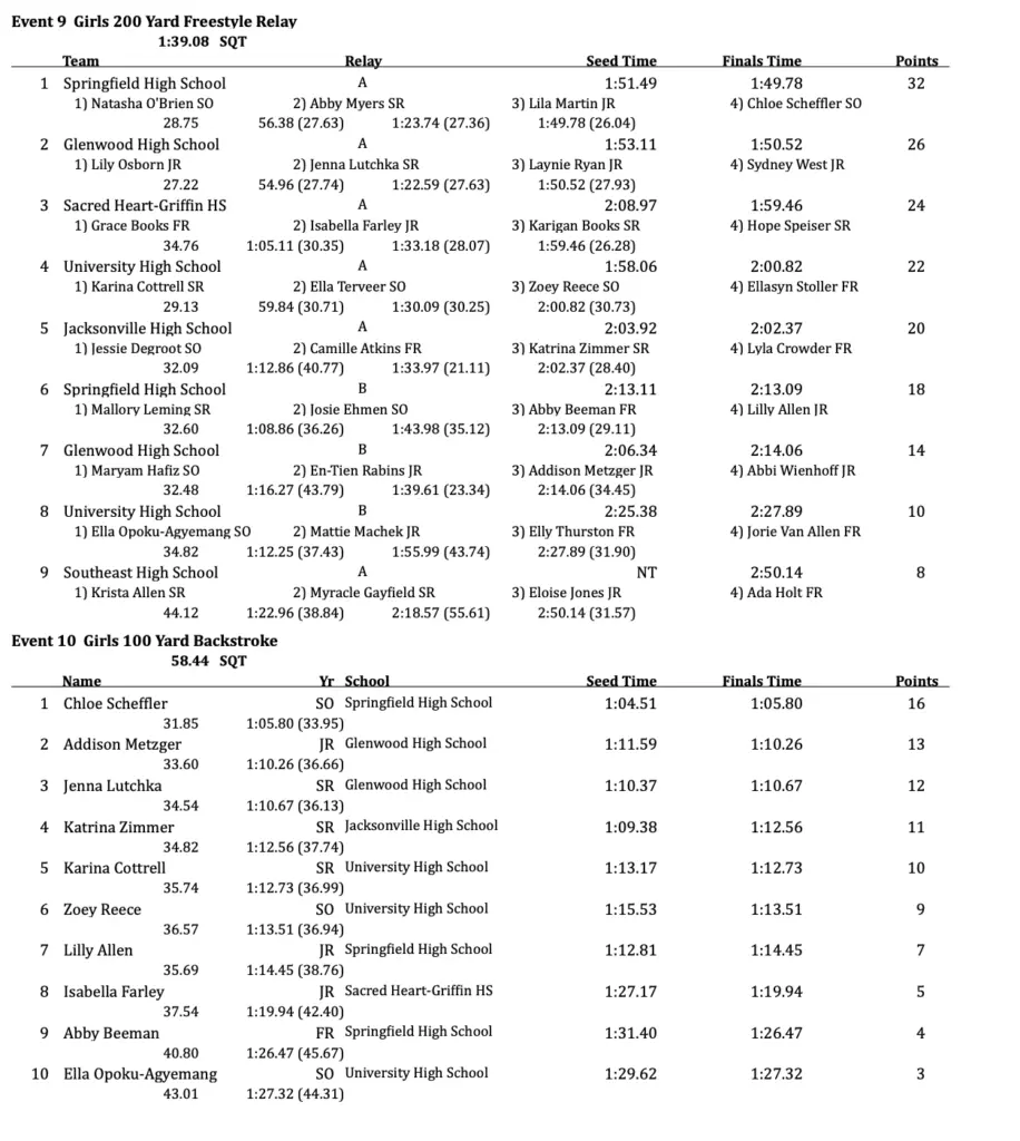 Glenwood narrowly won the 2025 Central State Eight girls swimming title. The Titans scored 356 points to U-High’s 338. Glenwood won seven of the twelve events en route to the title. Full results listed below.