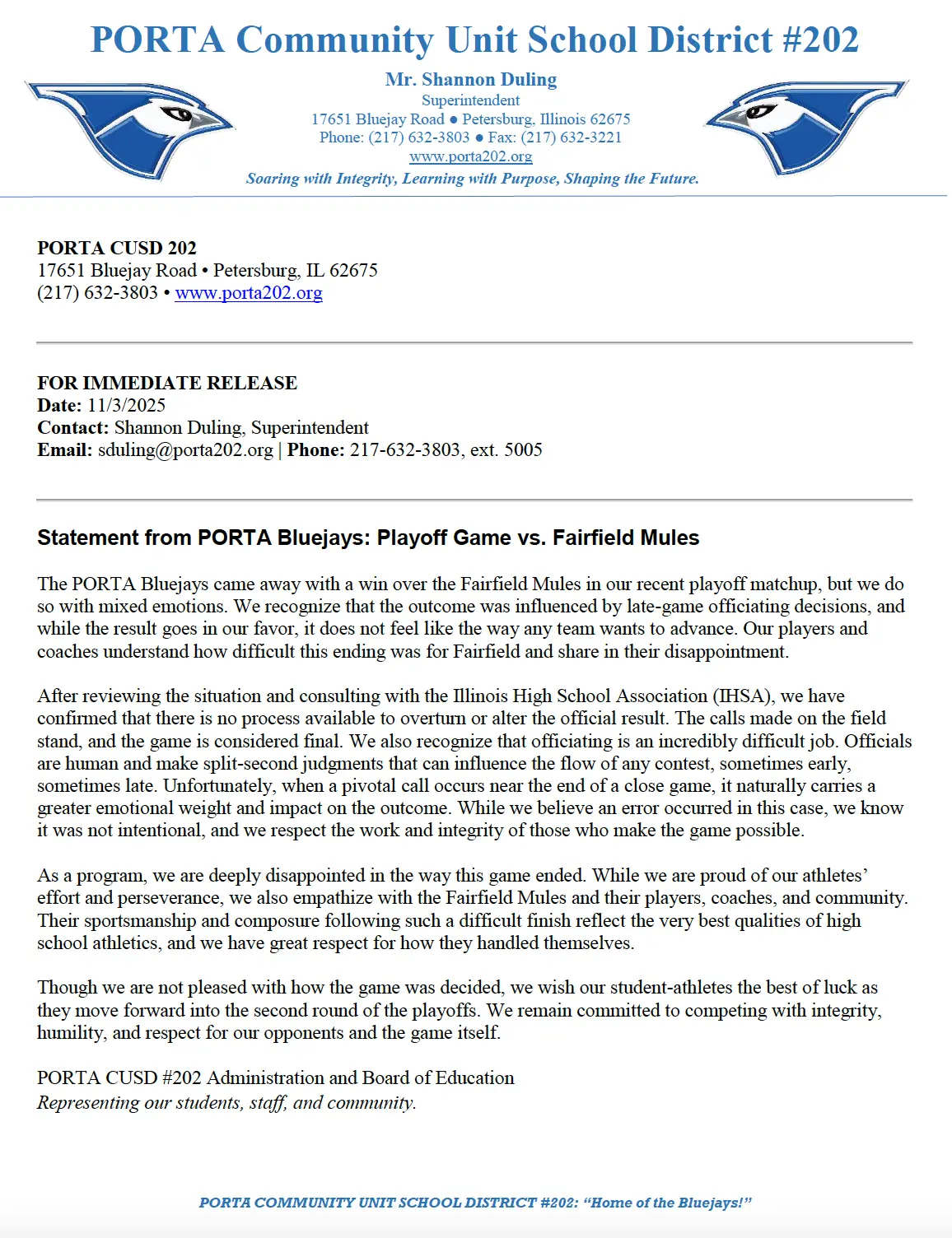 The PORTA Bluejays picked up a 9-8 win over Fairfield in round one of the playoffs for their first playoff victory since 2009. The win came on a 26 yard field goal from Hunter Morris as time expired. The Bluejays will travel to Williamsville for round two next weekend.