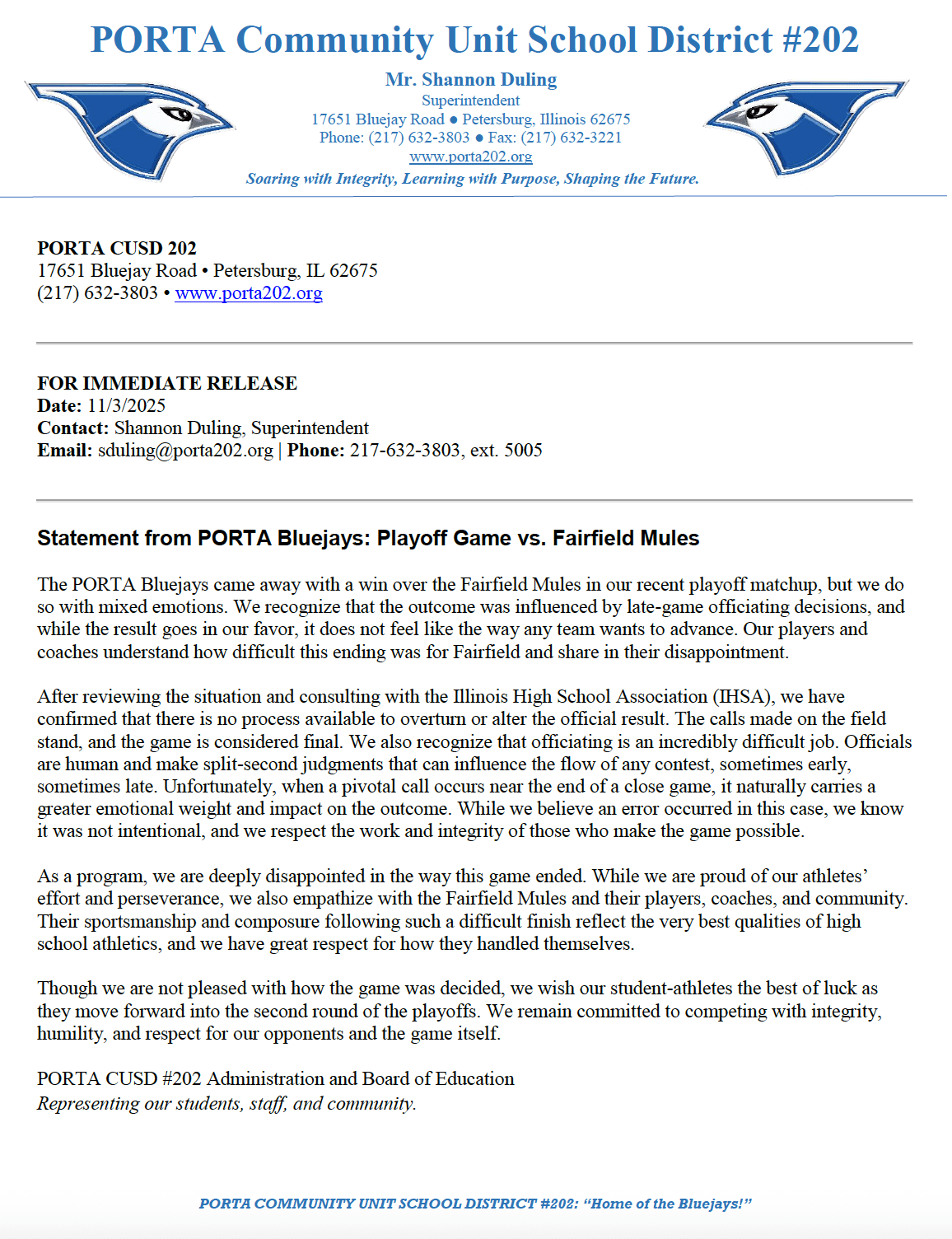 Statement from PORTA Bluejays: Playoff Game vs Fairfield Mules