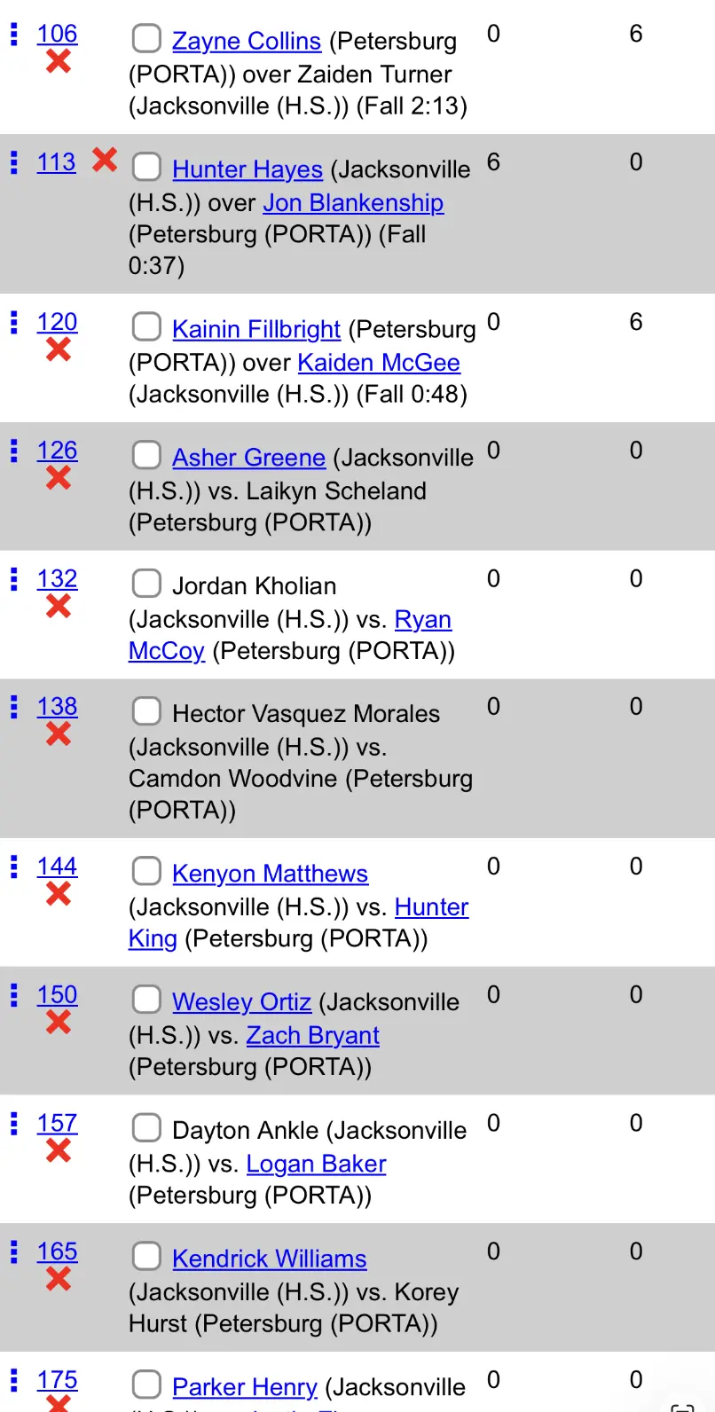 The PORTA Bluejays beat Jacksonville 42-32 on the wrestling mat on Wednesday night in a non conference team dual. Results posted below –