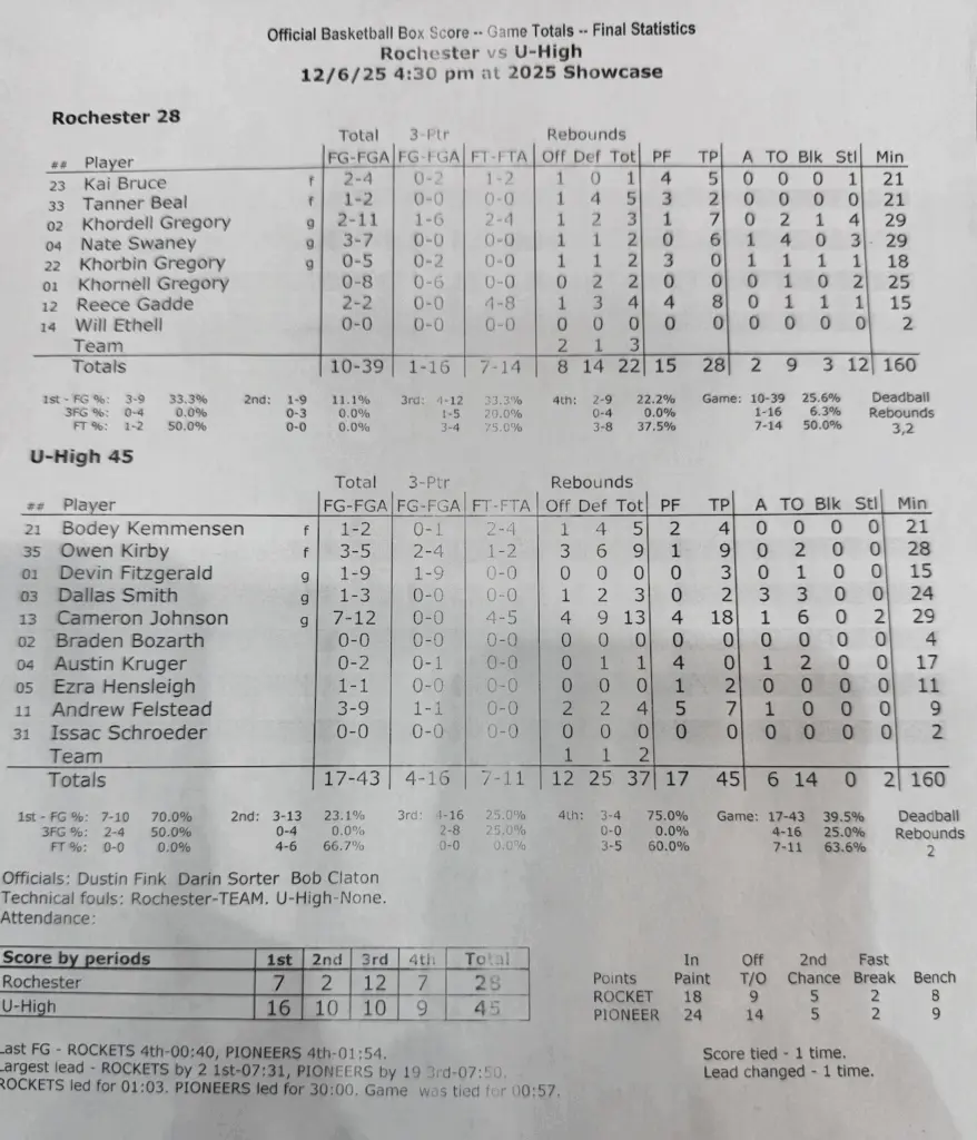 Normal U-High’s Cameron Johnson was the only player to score double figures in U-High’s 45-28 win against Rochester at the Capital City Showcase. Johnson had a double-double, scoring 18 and picking up 13 rebounds. Rece Gade was the Rockets leading scorer with 8. Rochester and U-High both play next on Tuesday, the Rockets against Lincoln and Pioneers against MacArthur.