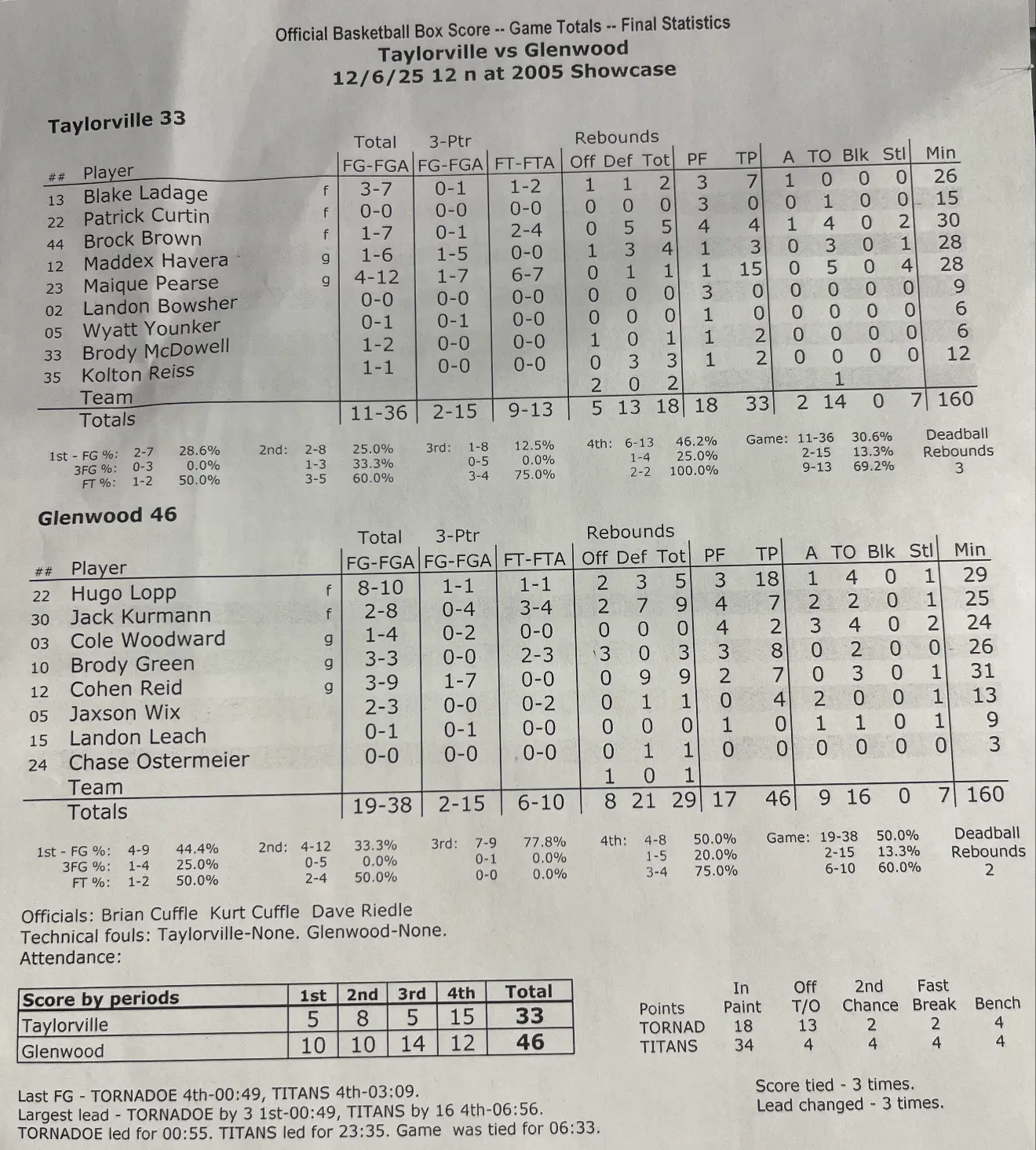 Hugo Lopp scored 18 points to power Glenwood to a 46-33 win over Taylorville in the third game of the Capital City Showcase on Saturday afternoon at the BOS Center. Malique Pearse led the Tornadoes with 15 points.