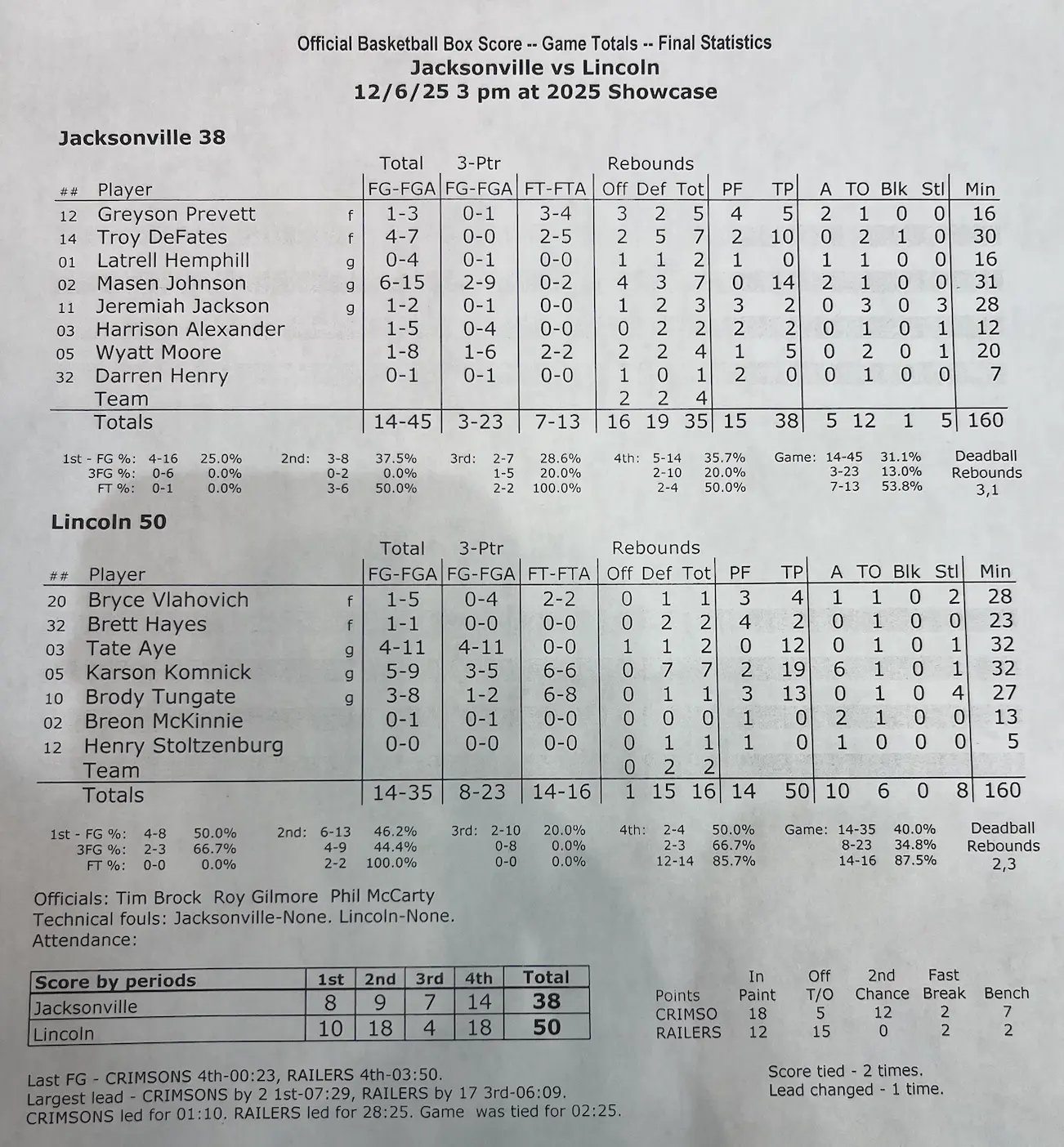 Lincoln had three in double figures led by Karson Komnick’s 19 points to beat Jacksonville 50-38 in the Capital City Showcase at the BOS center on Saturday afternoon in CS8 action. Masen Johnson led the Crimsons with 14 points.