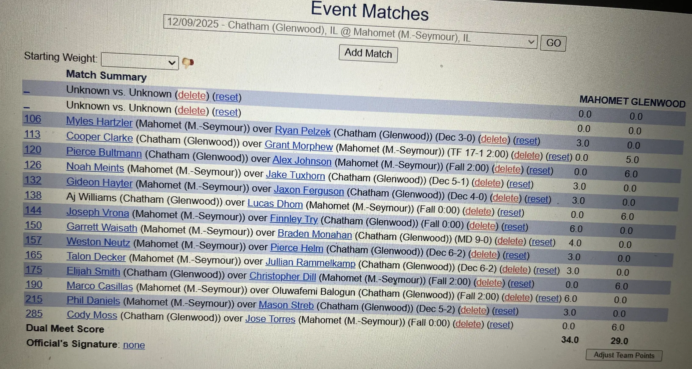 Mahomet-Seymour went on a run of four straight wins from 144 to 165 that helped them earn a tough fought 34-29 win over Glenwood on Tuesday. The Bulldogs entered as the #4 ranked team in 2A taking on the #6 ranked Titans on their home mats in Chatham.