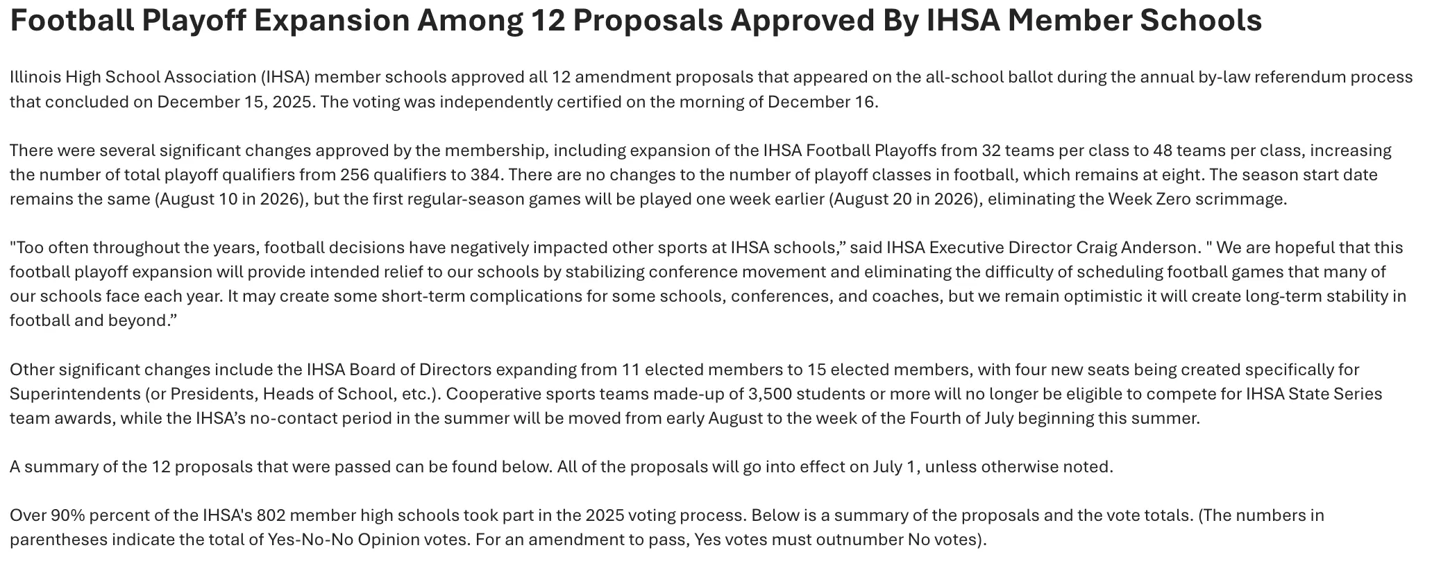 Football Playoff Expansion Among 12 Proposals Approved By IHSA Member Schools