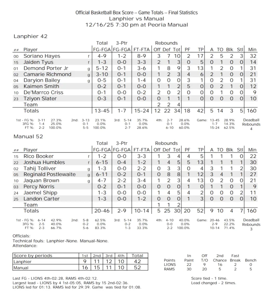Lanphier met Peoria Manual for a Tuesday night non-conference matchup with the Rams coming away with a 52-42 win. Soriano Hayes led Lanphier with 17 points while Manual had three in double figures. Highlights thanks to WMBD.