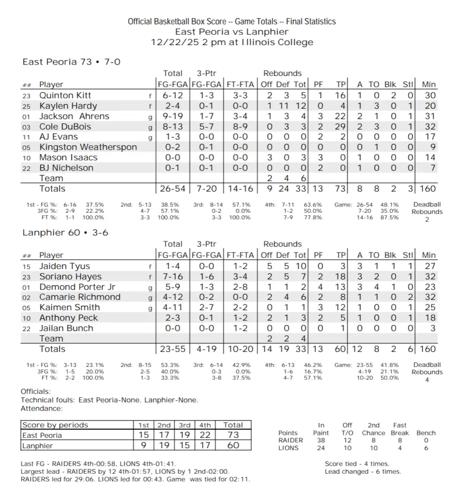 East Peoria’s Cole DuBois led the way with 29 points in the Raiders 73-60 win over Lanphier at the IC Winter Showcase. Jackson Ahrens added 22 for East Peoria while Soriano Hayes led Lanphier with 18. The Lions have a week off before their opening game at the Pekin Holiday tournament on Monday.
