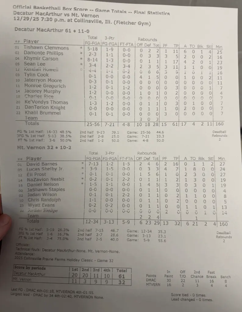 The MacArthur Generals controlled the Collinsville Holiday Classic title game from the opening tip. The Generals scored first and never trailed Mt. Vernon, taking the title with a 61-32 score. Khymir Carson scored 17 points and was named tournament MVP. Sean Lee and Tishawn Clemmons were also named to the all-tournament team while scoring 11 in the championship game.