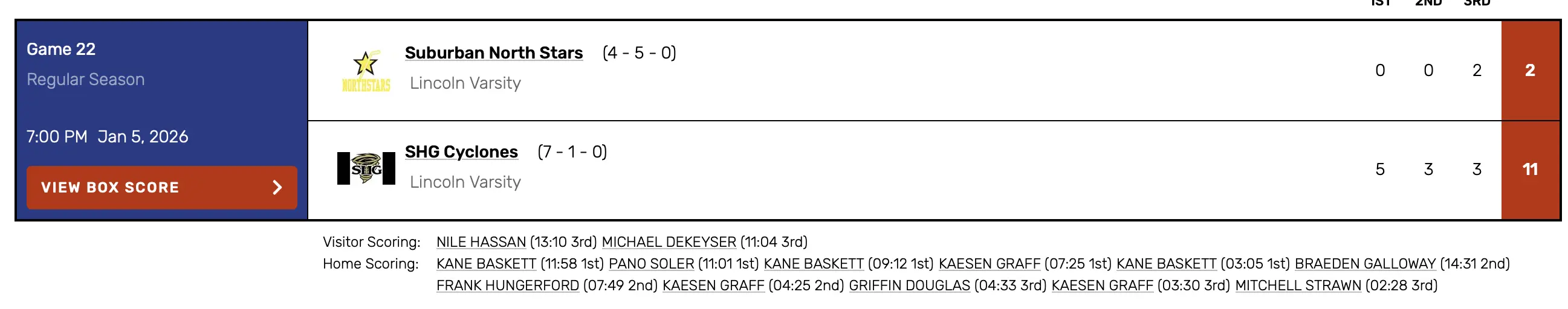 Kane Baskett scored a hat trick in the first period and Kaesen Graff picked up one late in the third period to power the Cyclones offense on Monday night. Sacred Heart Griffin beat the Suburban North Stars 11-2 to stay in second place in the Lincoln Land High School Hockey league standings.