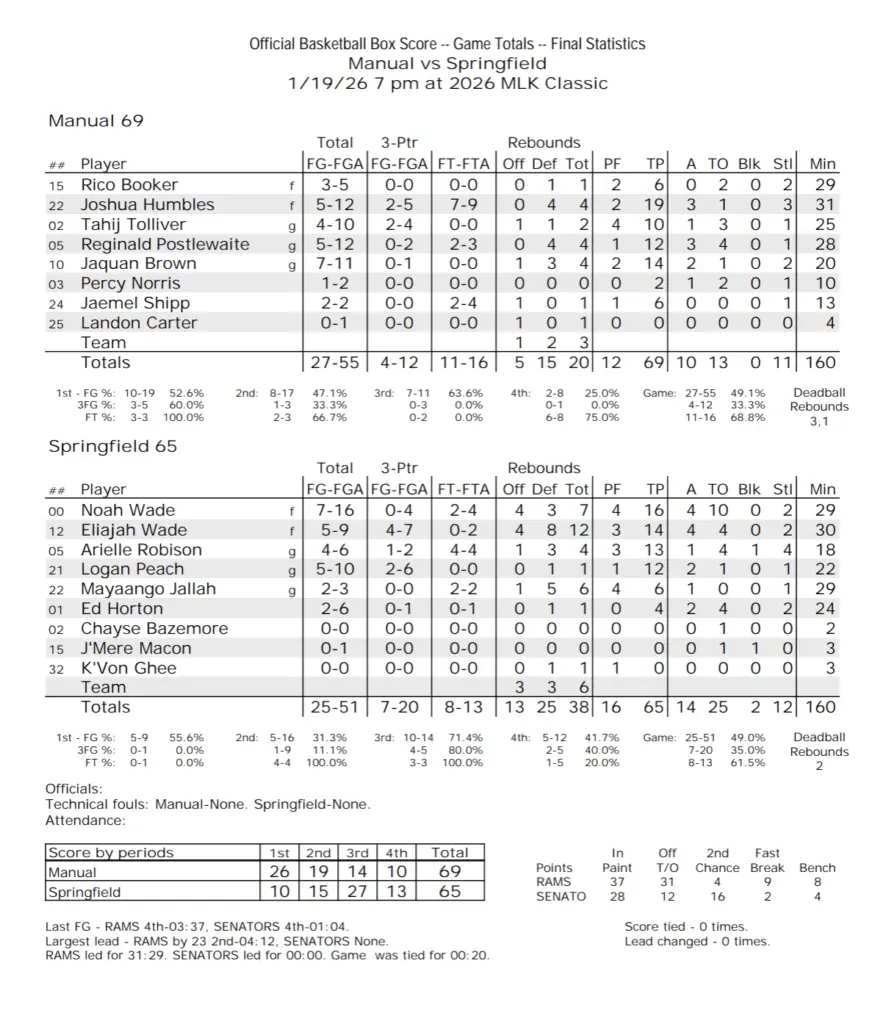 Springfield High faced a deficit of 26 points in the middle of the second quarter. Early in the third, it was still 22 but the Senators rallied. They closed within two points with a minute to go before the Rams made their free throws to ice the game and win 69-65. Each team put four scorers in double figures with Joshua Humbles leading the game at 19 for Manual. The Senators now gear up for the City Tournament where they’ll face Southeast on Thursday night.