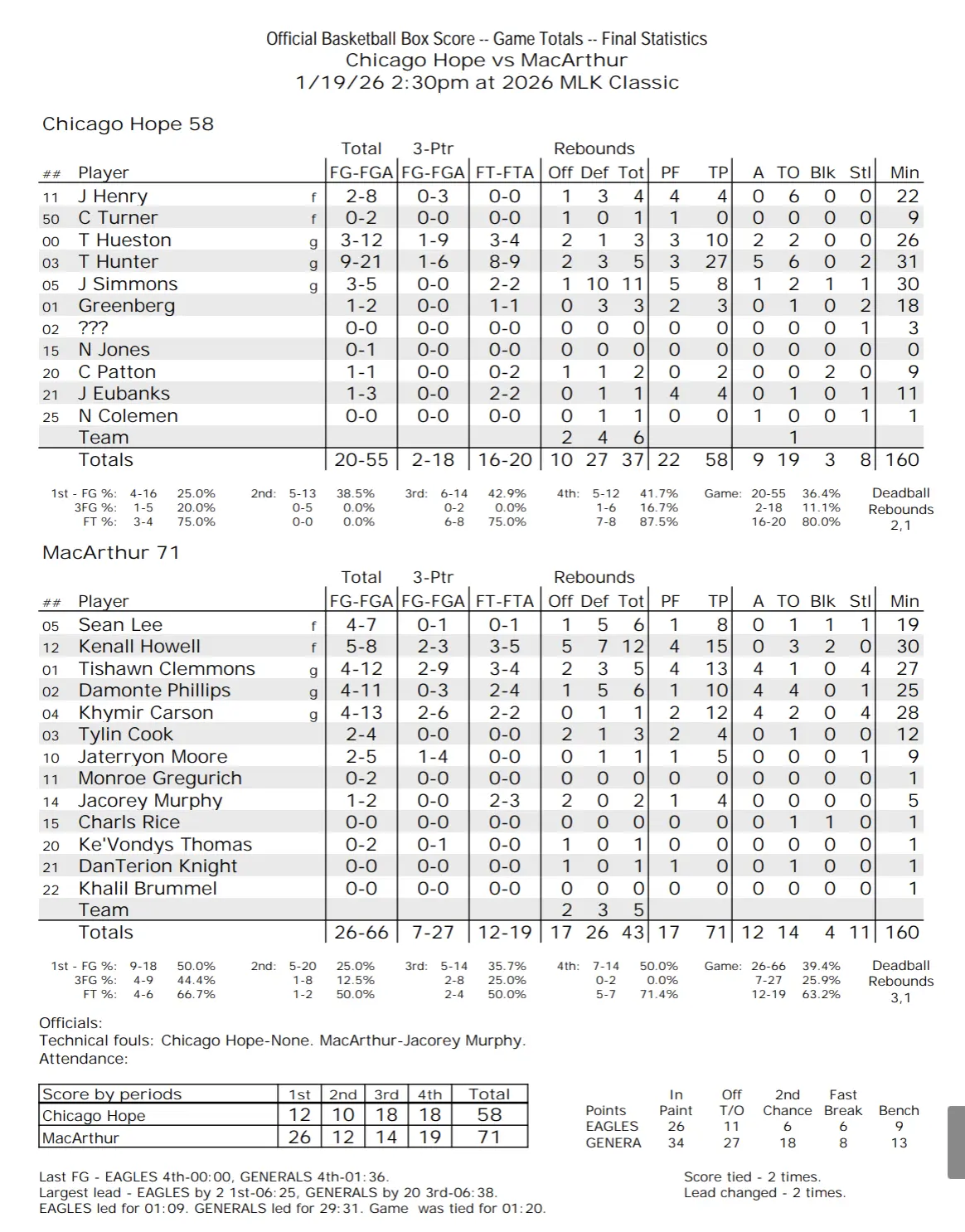 The MacArthur Generals used hot shooting in the first quarter to grab a 26-12 lead after one quarter. Chicago Hope Academy cut the lead down to ten in the second half thanks to 27 points from TyJuan Hunter but MacArthur improved to 17-1 with a 71-58 victory over the Eagles. MacArthur suffered its first loss of the season on Saturday against Vashon and will now travel to Urbana on Tuesday.