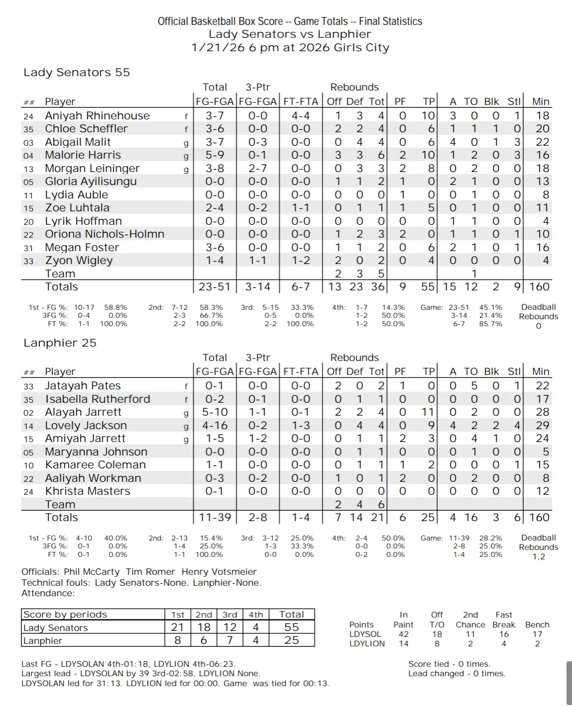 Lock down defense to start the second and third quarters was enough for the Senators to build a big lead to open up the 2026 City Tournament. Springfield High put a running clock on Lanphier for a 55-25 victory to move the Senators to 1-0 in the girls City tourney. Aniyah Rhinehouse and Mallory Harris led the Senators with 10 points each.