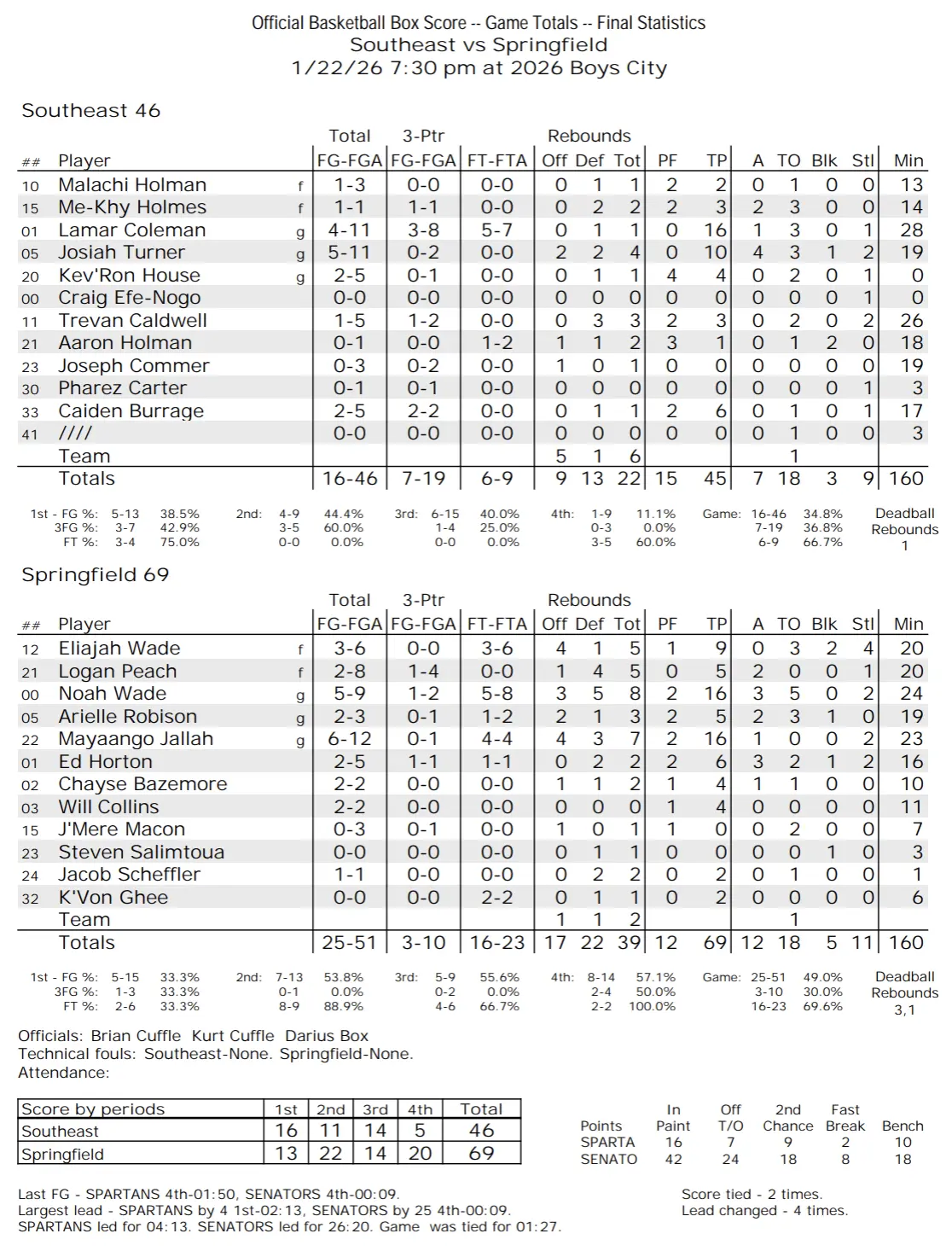 Southeast had a lead after the opening quarter and hung around for most of the first half. The top seeded Springfield High Senators were able to pull away and take control early in the second half on their way to a 69-46 win over the Spartans. Noah Wade and Mayango Jallah each scored 16 points for the Senators who will play SHG (1-0) in the nightcap on Friday.
