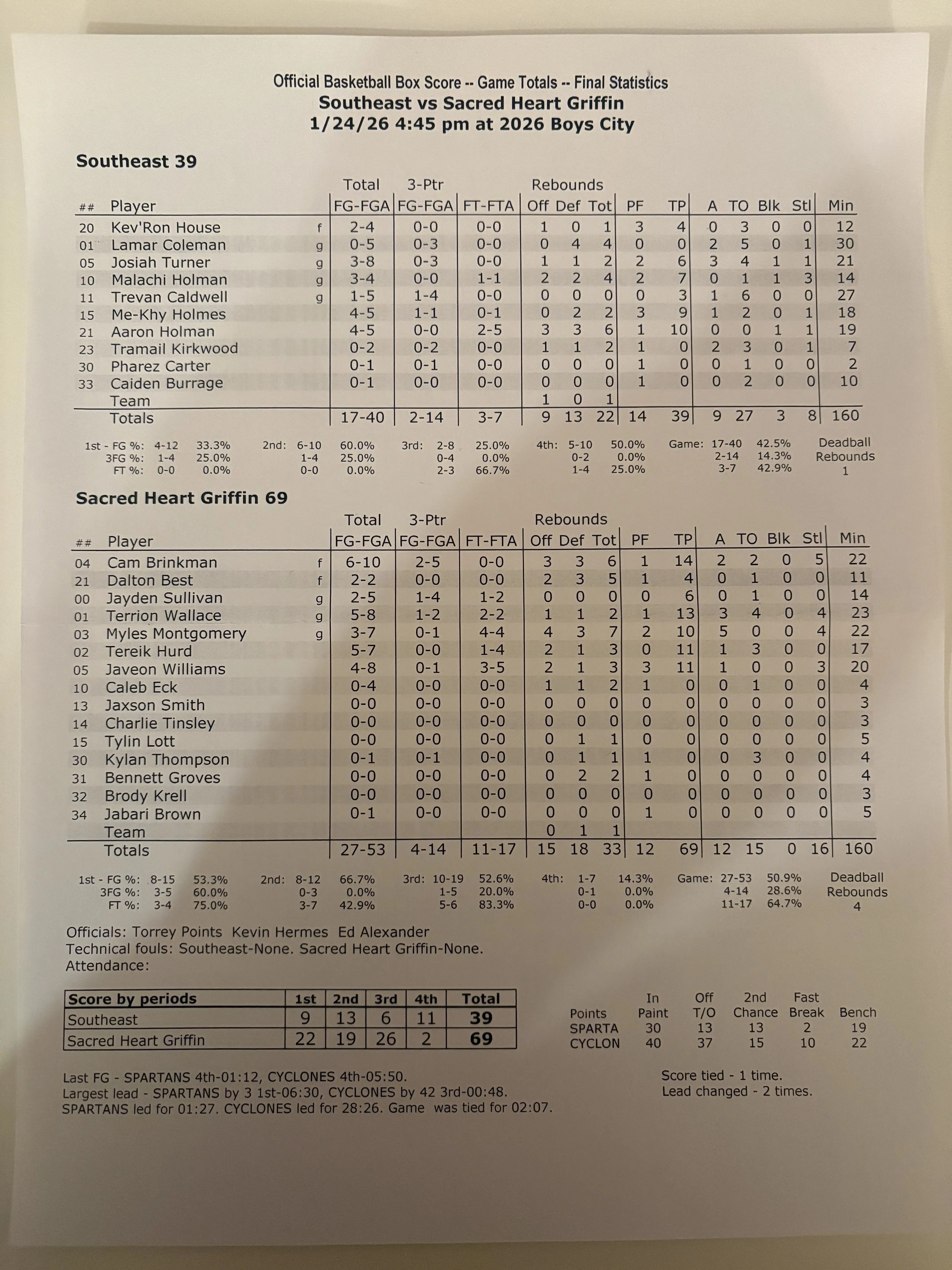 The Sacred Heart Griffin Cyclones picked up a 69-39 victory over Southeast to finish 2026 City Tournament play. The win gave the Cyclones a 2-1 record in the tournament which would set them up for a share of the City title if Lanphier was to beat Springfield High in the nightcap. SHG was led by five players who all finished in double figures.