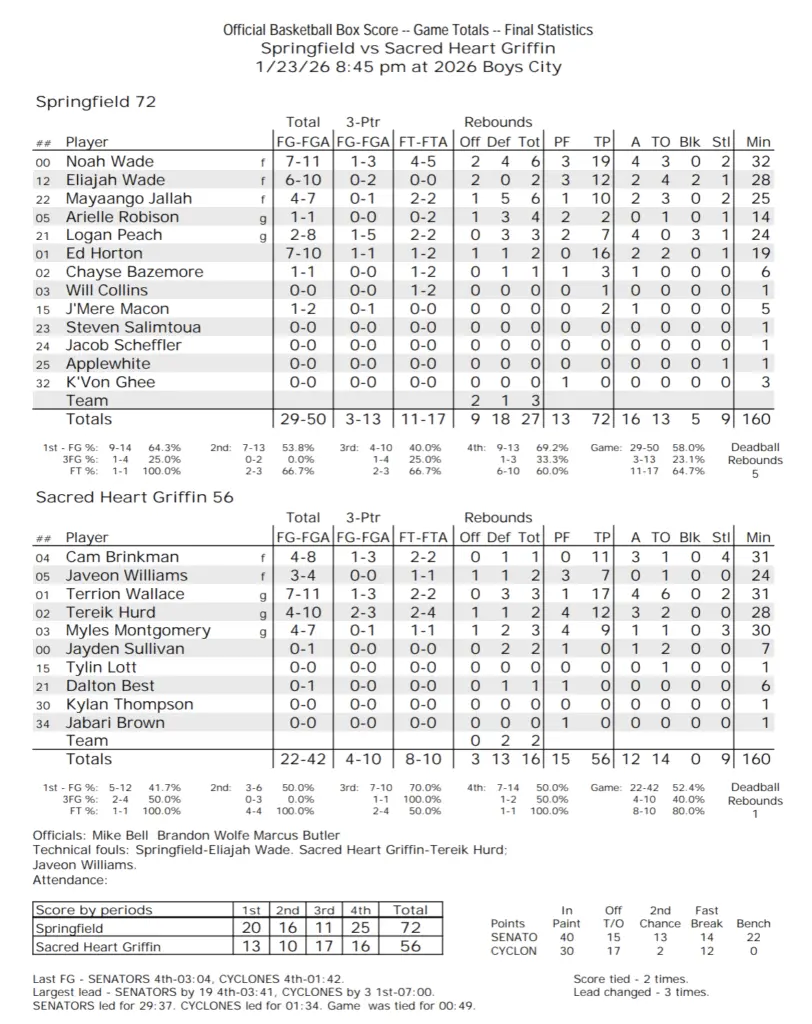 Springfield High and SHG met to close night three of the 2026 City Tournament, with the winning squad heading into Saturday with a 2-0 record. The Senators led most of the way and took a 72-56 victory. Noah Wade led all scorers with 19 points while Terrion Wallace scored 17 for SHG. The Cyclones play Southeast at 4:45 Saturday while the Senators play Lanphier at 8:30. A win for Springfield would wrap up the outright City title.