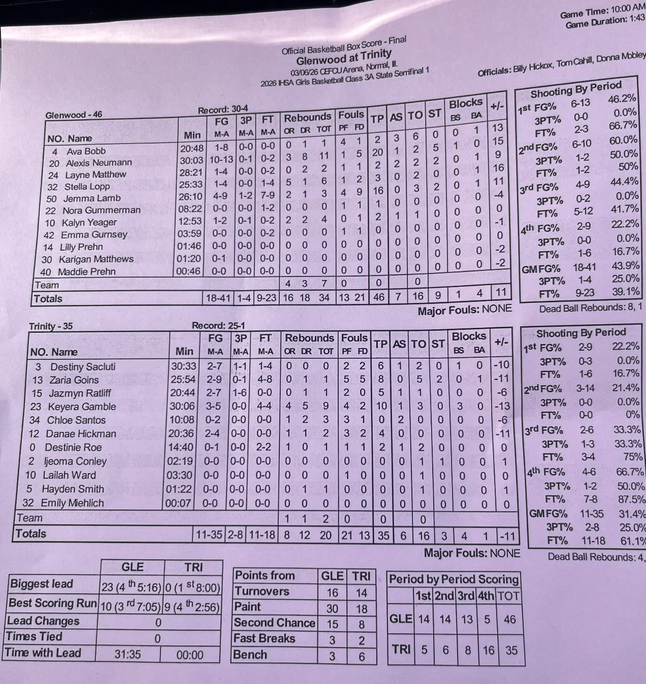 Alexis Neumann scored 20 points, grabbed 11 rebounds and 5 steals to power Glenwood to a 46-35 win over River Forest Trinity in the 3A state semifinal on Friday. Jemma Lamb added 16 points for the Titans, who led 41-19 after three quarters. The Titans will play in the 3A state title at 4 pm at CEFCU arena on Saturday against Washington.