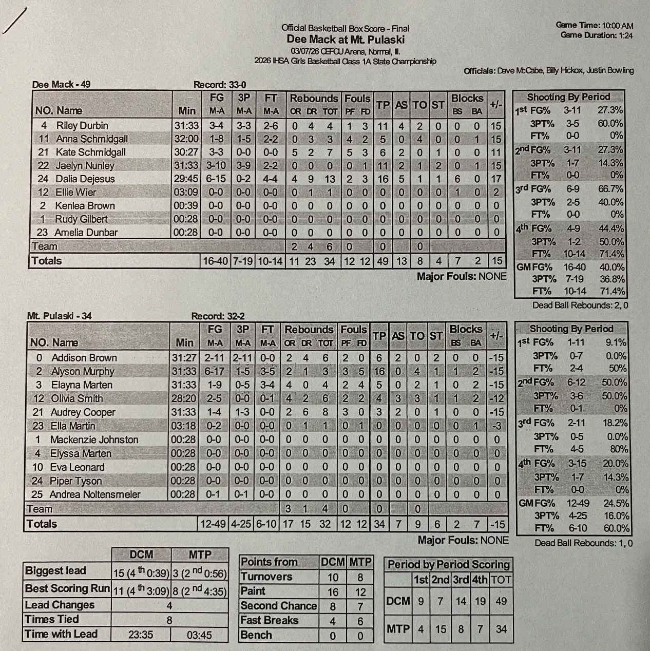 Deer Creek Mackinaw senior Dalia Dejesus scored 16 points, grabbed 13 rebounds, had 6 blocks and 5 assists to power the Chiefs to a 49-34 win over Mt Pulaski in the Class 1A state championship on Saturday. The Hilltoppers had a three point lead at the half and trailed by three heading into the fourth quarter. Mt Pulaski finishes the season 32-2, while the Chiefs finished a perfect 33-0.