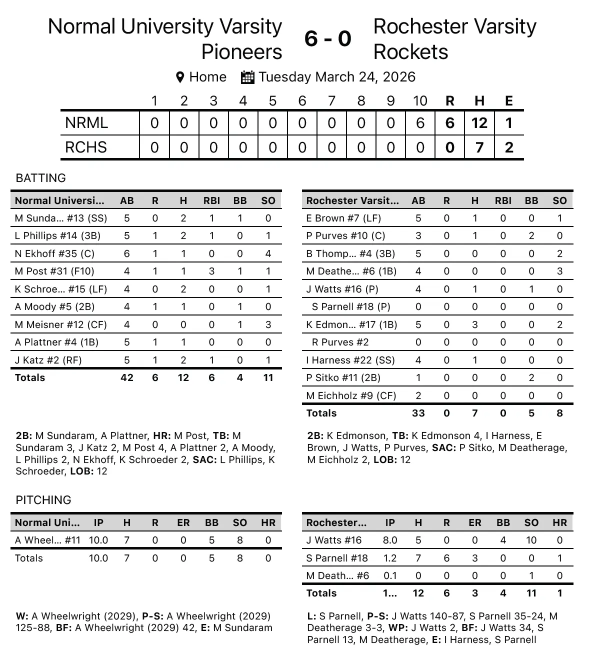 Scoreless after nine innings it was Normal U-High’s Makenzie Post who hit a three-run home run to open up the scoring in the top of the tenth as the Pioneers earned a 6-0 CS8 win over Rochester. The Pioneers move to 1-0 in the conference and host Tolono Unity on Friday while Rochester travels to QND on Wednesday.