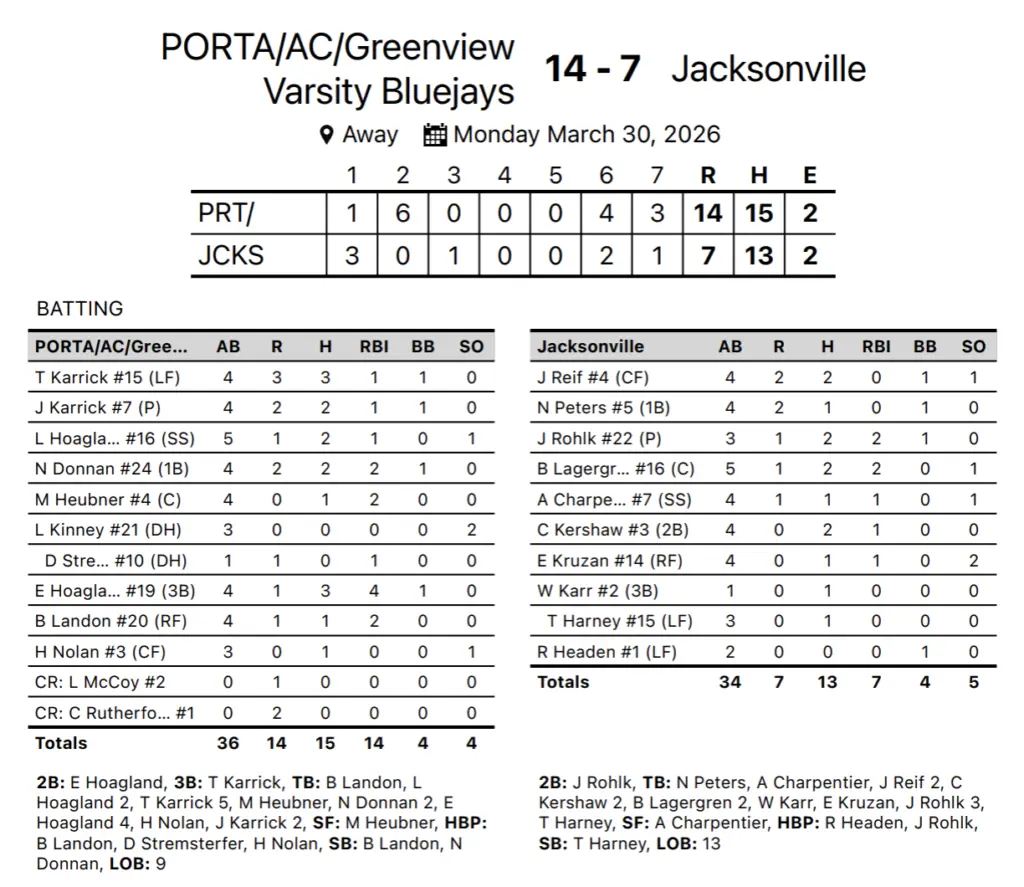 PORTA came out on top in a battle against Jacksonville, winning 14-7. Eight different Bluejays drove in runs in the win, led by Ethan Hoagland with 4 RBI. PORTA is now 7-2 with a game at Southeast upcoming on Thursday. Jacksonville falls to 5-2 and they play at home against Springfield High tomorrow.
